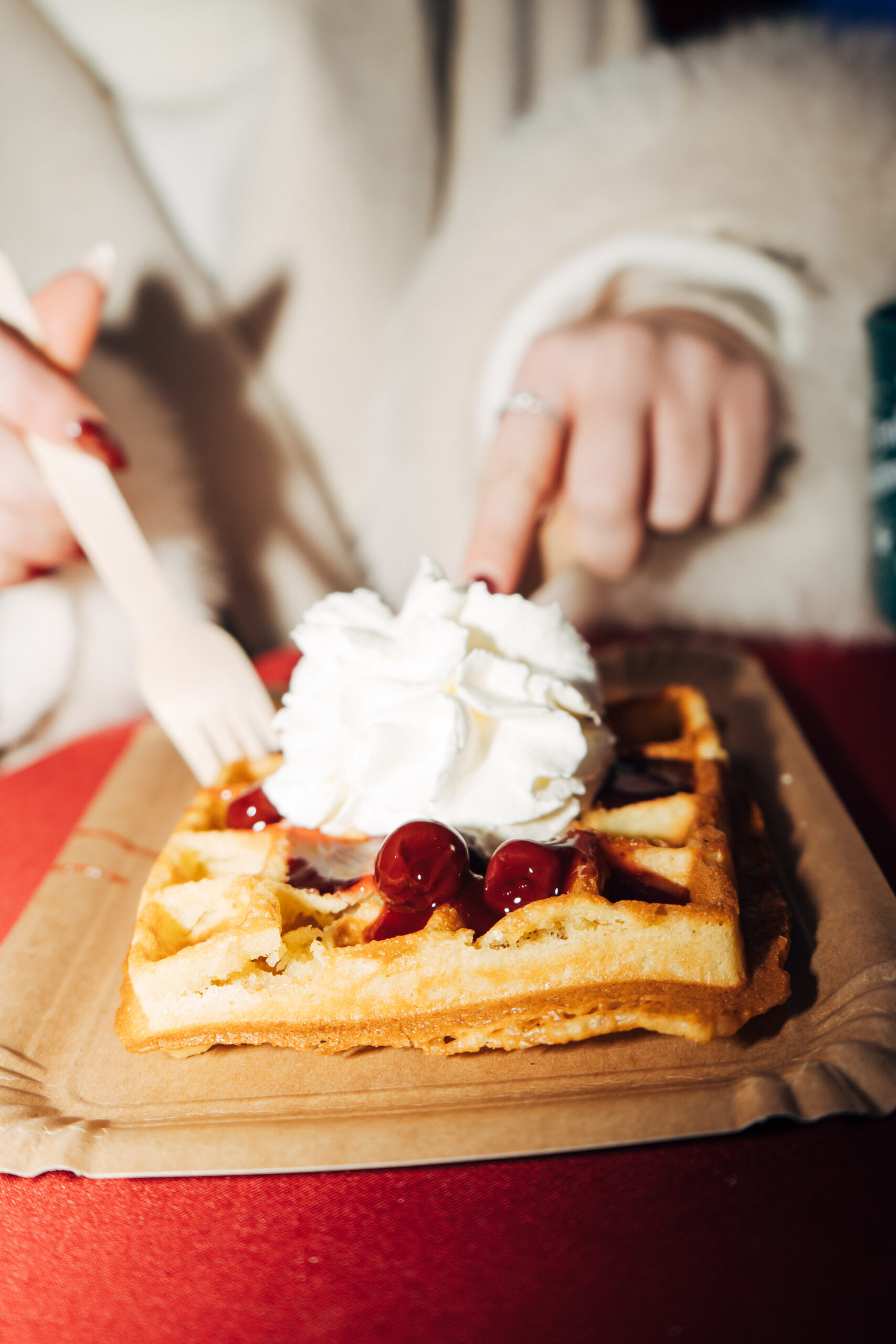 Fresh gebackene Brüsseler Waffeln mit hausgemachter roter Grütze und Vanillesauce